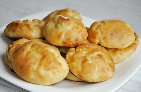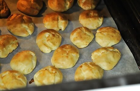 Bake for fifteen minutes. Put the pan into the oven and bake for five minutes. After five minutes, lower the heat to 375°F (190°C) and bake for 20 to 25 more minutes. The finished puffs should be golden brown. You can rotate the pans when you lower the heat if you wish.