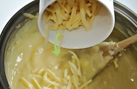 Add the cheese. Put cheese into the mixture after the eggs have been added. A sharp cheese is ideal, like gruyére or cheddar, but you can also use a cheese like comté. The cheese should already be grated at this point. Pour it into the mixture and combine.