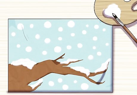 Use white paint to create snowflakes. Dip a paintbrush in white paint. Dab the paintbrush on the construction paper to make white dots for snowflakes. You can also paint snow onto the branch by running the paintbrush along its length. If you have a bit more skill, you can paint more intricate snowflakes, using linear strokes to create snowflake patterns. Instead of painting snowflakes, you can make them out of paper and glue them onto your piece.