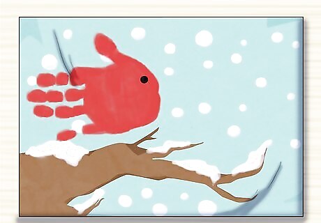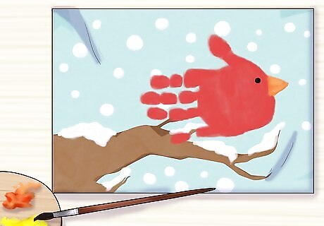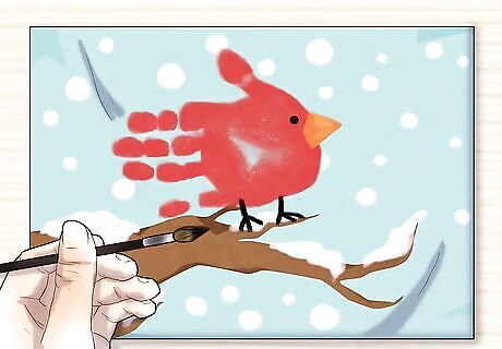 Paint the cardinal’s legs with black paint. Paint two long lines, starting at the bottom of the handprint and stopping just above the branch, to make the legs. Then paint three smaller lines at an angle, forming the cardinal’s toes at the tip of each leg. The toes should overlap the branch slightly.