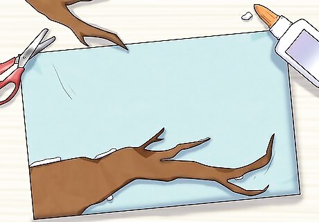 Cut out and glue on a branch. Using scissors, cut a branch out of brown construction paper. Make sure the branch is large enough to hold the bird you’ll be painting on later. Use white craft glue to glue the branch onto your background, near the bottom of the page. Instead of construction paper, you can also paint a branch onto your blue construction paper using brown paint.