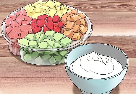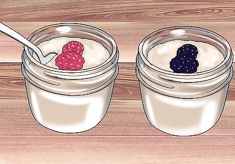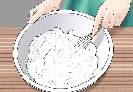 Try Greek yogurt ranch dip. If you love raw vegetables and dip, try making your own homemade ranch dip at home. Again, Greek yogurt helps lower the calories on this tasty dip. Start by spooning about 1 cup of plain, non-fat Greek yogurt into a small bowl. Then, mix in the following: 2 tablespoon (29.6 ml) of dried parsley, 2 teaspoons of garlic powder, 2 teaspoons of onion powder, 1 1/2 teaspoons of dried dill, 1 teaspoon of black pepper, 1 teaspoon of dried chives and 1 teaspoon of salt. Mix everything together until all the spices are mixed throughout the yogurt. Taste and adjust for seasonings. Refrigerate for at least 30 minutes. Serve with your favorite raw vegetables as the perfect snack.