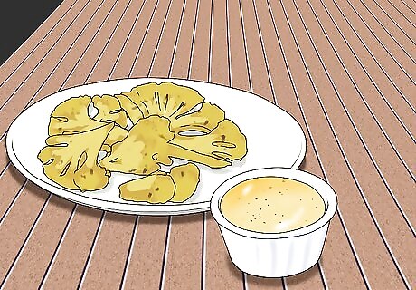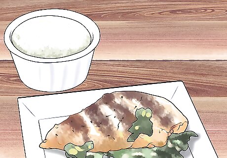 Try flavor-packed cooking methods. Some cooking methods impart a ton of flavor to foods, while others leave them a little bland. Try using cooking techniques that can help increase the flavor of your foods. Some cooking methods, like steaming, don't impart a lot of great flavor to foods. That's why drizzling cheese sauce over plain steamed broccoli is so appealing. Steaming, sautéing, boiling or poaching don't always add a lot of flavor to foods. To help get you used to using less of those higher calorie sauces or dressings, skip these cooking methods and opt for something a little more flavorful. Grilling is a great cooking method that's not only healthy, but imparts a huge amount of flavor to foods. When foods (like proteins, vegetables or even fruits) are grilled, they get a wonderful sear on the outside. This gives flavors a great smoky, charred flavor without any added dressings. Roasting is another great technique — especially for vegetables. Roasting uses the high temperature of the oven to slowly caramelize and brown the outside of foods. They become soft, nutty and sweet. No need for added dressings or sauces here either.