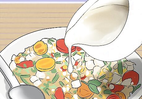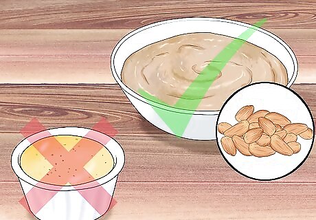 Swap nuts in for cream-based sauces. You may be surprised that traditionally higher calorie dairy sauces and dressings can also be made from nuts. This is a great method to improving the overall nutrition on some of your favorite sauces. Nuts are a great way to improve some of those higher calorie sauces. Nuts are high in protein, healthy fats and minerals. Although nuts are high in calories, they are also high in protein, healthy fats, and minerals, which traditional cream-based sauces lack. Nuts also contain a good amount of fat, but the type of fat found in nuts is a type of heart healthy fat known as omega-3s. This type of fat has been shown to be beneficial to your cardiovascular system. To use nuts as the base of creamy sauces, you'll need to soak them in hot water to help soften them. Then, blend or puree them with your favorite spices or seasonings.