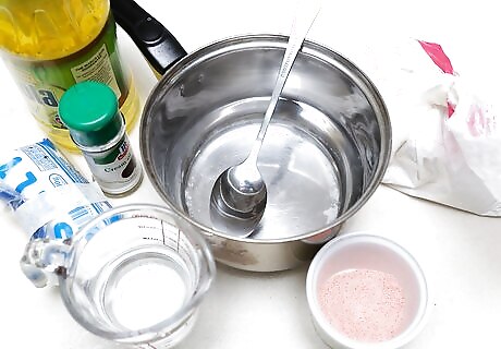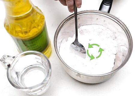 Mix the ingredients together. First, mix the flour, salt, Kool-Aid, and cream of tartar together with a whisk until they’re completely combined. Next, stir in the oil with a spoon. Once the oil is completely absorbed into the dough, carefully pour in the water. The dough should be wet enough to pull away from the sides of the pan when stirred but dry enough to hold its shape. Add the water very slowly. You can always add more, but you can’t take water out! Make sure to scrape the corners of the pot to completely saturate the dry mixture.