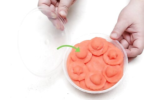 Store the dough. If the dough is exposed to air it will dry out and harden. Airtight Tupperware containers are commonly used for storing playdough. You could also use sealable plastic bags. Just make sure you press all of the air out of the bag before you seal it. Store the dough in the refrigerator between uses. This dough will last for about two weeks. If you want to store the playdough creatively press the dough into plastic Easter eggs. Write the date on the bag or Tupperware container so that you know when to throw the dough out.