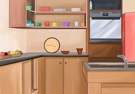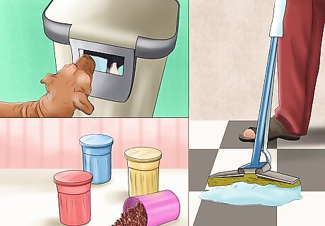 Organize the kitchen. The kitchen can be a wonderful playground for a curious—and hungry—dog. Storing potentially harmful foods and chemicals and closing off containers and spaces can go far in keeping your dog safe. Make sure your garbage can is secured with a lid that your dog can’t remove. An open garbage can provide your dog with otherwise forbidden food but can also expose her to other hazards such as bones from food or chemicals. Keep food stored in airtight containers and in cabinets to which your dog can’t gain access. Put wrapped food in cabinets, too. Although the food may not be harmful to your dog, the wrapper could be. Put any cleaners, medications, or other chemicals on high shelves so that your dog can’t access them. If this isn’t possible, consider putting childproof latches on lower cabinets so your dog can’t pry them open. Clean up any food that falls on the ground when cooking or eating. Make sure to vacuum and mop the floor regularly to remove potentially harmful substances or foods. Make sure that sharp objects such as knives are stored in a drawer or cabinet that your dog can’t access. Consider unplugging any kitchen appliances that you are not using. For example, you could unplug the toaster or microwave so that your dog can’t chew on the cords.
