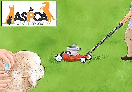Petscape your garden. You and your dog can get a lot of enjoyment out of a garden. But it can also present dangers to your dog in the form of plants, pesticides, and parasites. Caring for your garden while thinking of your dog’s needs can keep her safe while she is outside. Make sure your garden doesn’t have any plants that are poisonous to your dog. Some of the most beautiful flowers including daffodils and azaleas are toxic to dogs. Consult the ASPCA’s extensive database of toxic plants for dogs if you are unsure if a plant is potentially poisonous. Chemical fertilizers and insecticides can also be harmful or fatal if ingested by your dog. Consider organic gardening instead of chemicals to maintain your yard. You can consult your local county extension office for information on how to garden organically. Parasites such as fleas, ticks, and worms can harm your dog. The easiest way to prevent them from harming your dog is by getting a broad range flea and tick or heartworm medication. Be aware that most heartworm medications can prevent other worm and flea and tick infestations. Keep your dog inside when mowing the lawn or trimming the hedges.