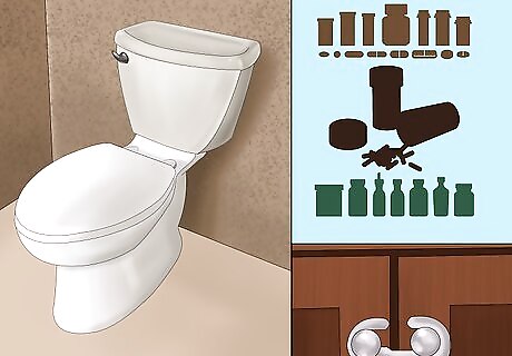 Secure the bathroom. Just like your kitchen, the bathroom can also present your dog with a playground and a place to grab a “drink.” Check your bathroom spaces for chemicals or potentially harmful items such as old towels, which can prevent injury and death. Store any cleaners, chemicals or medicines either on high shelves or in cabinets that you’ve secured with childproof latches. Use a garbage can that is covered to keep your dog from getting at chemicals, medications, or other items such as period products. You can also put the garbage can inside a latched cabinet with a cover. Keep the toilet lid closed at all times to prevent your dog from falling in, drowning, or drinking water that may have chemicals in it. You can also use a childproof latch on the toilet to keep your dog safe.