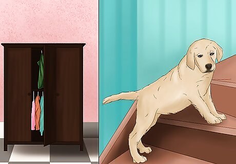 Check other spaces. In addition to bigger rooms, you should also check smaller areas of your home. Figure out if there are potential hazards in them that you should remove or cover. Some additional spaces you may want to check are: Stairs, by making sure they are free of objects and safe for elderly or small dogs to climb Closets and cupboards, which may store articles of clothing or chemicals.