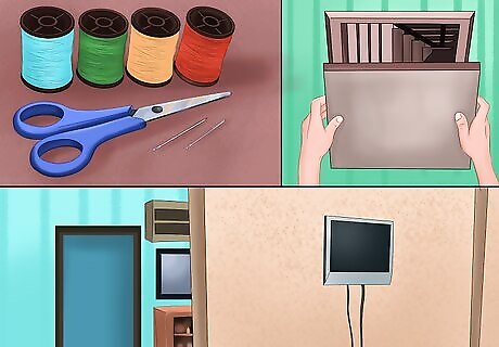 Remove hazards in the living and dining rooms. Chances are that your dog is spending a lot of quality time with you and your family in the living and/ or dining rooms. Checking for and removing any potentially dangerous items such as cords, toys, or other knick-knacks can prevent injury and even death. Look for dangling wires from electronics such as TVs, DVD players, stereos, lamps, and telephones and put them in a place that is out of reach to your dog. You may want to consider covering electrical outlets and unplug items you are not using to prevent electrocution through chewing. Consider getting rid of frayed wires, which can also electrocute your dog. Keep spaces clear of children’s toys or knick-knacks, including items such as sewing tools. Your dog may see these as chew toys and ingest small parts that could choke her. She could also knock them over and cause injury to herself. Cover all of the heating and air vents to prevent your dog from burning herself or getting too cold. Most home and pet stores offer different covers you can use. Move potentially poisonous plants to spaces your dog can’t access. This includes hanging plants onto which your dog can jump from nearby spaces. The American Society for the Prevention of Cruelty to Animals has a list of plants that are toxic to dogs that you can consult. Vacuum the space regularly to remove any small or undetectable hazards such as buttons, string, or toy parts that can choke your dog.