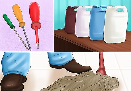 Keep the garage neat. Attached or stand-alone garages can also present dangers to your dog in the form of items such as sharp tools, chemicals, and even your car. Organizing your garage and putting potentially harmful objects in places your dog can’t reach can help prevent accidents or death. Store chemicals in secure containers and place them on either high shelves or behind secure doors. This is especially important with antifreeze, which has a smell and taste that attracts dogs. One lick of antifreeze can kill a dog. Make sure to clean the floor regularly, especially if you’ve been using antifreeze. Store sharp objects, tools, and cords in a place your dog can’t access. Consider keeping electronics or electric objects such as saws or screwdrivers unplugged to prevent the risk of electrocution or other injury. Check under or bang on the hood of your car to make sure your dog hasn’t crawled inside for warmth.