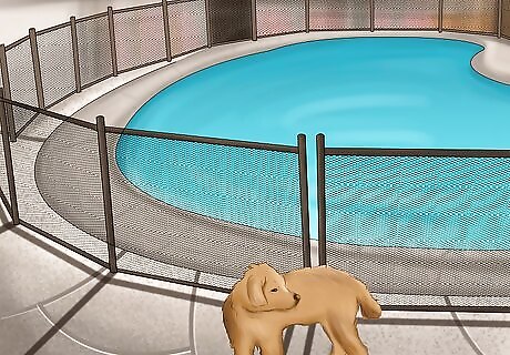 Install a pool gate. Although most dogs can swim, they can still drown in pools. Putting a fence around your pool can prevent this or other injuries she may get from toys or falling objects. If you cannot afford to install a fence or gate around your pool, consider getting a hard cover for it, which may deter her from jumping in the pool.