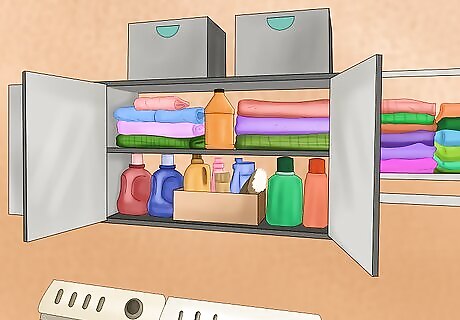 Arrange the laundry room. No matter if you have a designated laundry room or keep the washer and dryer in another space, it’s important to keep laundry areas organized. Storing detergents and putting away dirty clothes can keep your dog from ingesting potentially harmful substances. Make sure clothes are in a designated hamper or closet where you dog can’t access them. Remember that seemingly harmless items such as string, buttons, or embellishments can harm your dog. Put laundry detergent, fabric softener, dryer sheets and other chemicals on a high shelf or in a latched cabinet so that your dog can’t eat or drink them. Make sure your dog hasn’t jumped into the dryer or washer each time you use them.
