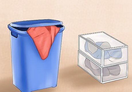 Pick up your bedroom. Even seemingly non-hazardous items such as shoes or sweaters can harm your dog if ingested. Whether or not your dog sleeps with you at night or simply has access during the day, keep your bedroom organized and free of tempting “treats.” Make sure any laundry is in a basket or other covered container. Hang and store clothing in closets and dressers that your dog can’t access. Clothing items often have string and embellishments such as drawstrings, buttons, and appliques that can cause serious harm to your dog’s intestines. Store shoes in containers, a closet, or a shoe rack on the back of a door. Dogs often see shoes as chew toys and pieces can break off and choke your dog. Remove or cover any wires in the bedroom just as you would in other rooms. See if there are any medications or other items such as lotion that your dog can access and which may harm her. Check to make sure you haven’t accidentally closed your dog in a closet or drawer whenever you open it.