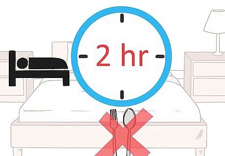 Avoid eating meals for at least two hours before sleep. One of the main problems with eating before bedtime is that these most likely constitute as extra calories from an extra meal that may push you over your caloric intake for the day. But eating before bed, especially sugary (or otherwise unhealthy) items can cause a spike in your blood sugar that delays your sleep hormones. A good rule of thumb is to avoid eating for at least two hours before bed. If you must eat something before bed, try to eat something that is high in fiber and low in sugar like apple slices and almond butter, some carrot sticks with hummus, or half an avocado.