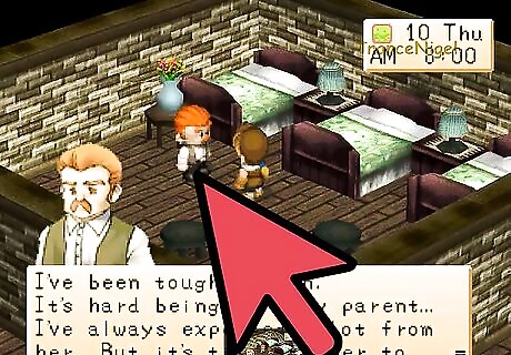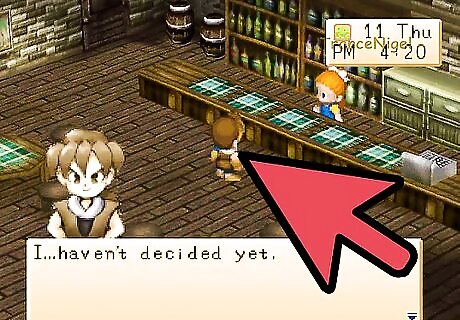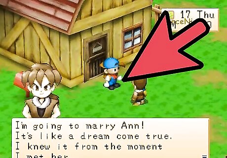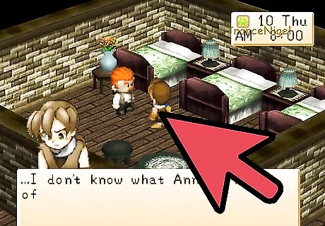 Be involved in the Heart Events: Black -> Purple -> Blue -> Green -> Yellow -> Orange -> Red Black Heart Event: Go to Doug's Inn between 10:40am and 1pm. Ann and her dad Doug are greeting people as they come in the front door. Ann notices that you've decided to pay them a visit and asks if you would like a meal. You automatically agree, so Ann asks if you would wait a little bit and then says they're going to have a feast! Of course after she announces it she remembers to ask her dad if it's all right. Doug says you're a special guest so it's all good. Ann is happy and asks you to confirm if you would like to eat with them. Select that you would like to eat (option 1). Ann is happy so Doug says he's going to organize some delicious food for them. Ann says her dad's cooking is very yummy.Soon Doug happily returns with the food and you scarf it down. Ann and Doug both ask if you though it was good, which it was. Doug laughs and asks if it's hard to resist second helpings (of food), then he and Ann both giggle. After the meal is done, Ann sees that her dad is feeling pretty good. Doug says he likes to make things, then says you should come and meet with Ann more often! Poor Ann becomes embarrassed. Purple Heart Event: Go up to the second floor of the Inn between 10am and 1pm on Wednesday, Thursday, Friday, or Saturday. In one of the rooms you'll find Ann, who appears to be practicing her singing. Enter the room and she'll become startled, unaware that anyone was listening to her. It turns out that Ann was really cleaning and she asks if you like to clean too. If you tell her you like cleaning, she'll be happy. Note: Before entering Doug's house, remember NOT to hold anything in your hands or the event won't come. Blue Heart Event: If you go to the Inn on Monday or Friday between noon and 7pm, you'll find Ann and her Dad having a conversation. Doug asks Ann what is wrong but she replies that she's alright. Doug knows something is wrong because her face is very pale. Suddenly Ann starts complaining about stomach pains and Doug gets worried. In you walk and Doug is gratefully for your arrival. He asks what he should do, so tell him to take her to the Clinic. At the Hospital Ann is feeling much better. The doctor said that she had something bad to eat. When Doug asks Ann what she ate, she tells him nervously that she ate a Stir Fry, Omelet Rice, Savory Pancake, AND Tempura. She's not done though and admits she also ate some Cheesecake, Apple Pie, Cookies, Ice Cream, and some Pumpkin Pudding! No wonder she has a tummy ache! Doug scolds her for eating so much food and Elli tells her not to eat so much. Back at the Inn Ann says she's sorry for making a mess of things. To thank you she gives you her favorite broken music box. Green heart event: You don't get an event. Just keep on giving her gifts. Yellow Heart Event: Go to the Inn on Wednesday, Thursday, Saturday, or Sunday between 10am and 7pm. Doug will welcome you in and then says he has something to discuss with you. He says it's been difficult to raise Ann since her mother died and he's tried his best. Doug asks if you "like" his daughter. If you tell him you do (option 1) he'll be happy.Ann will then walk in and ask what the two of you are doing. Doug acts all innocent until she walks up next to you, then he start acting cheerful. Ann won't be fooled by her father and knows he's talking about her with you. She gets mad at him and runs off. Doug nervously laughs at her. Orange Heart Event: You don't get an event. Just keep on giving her gifts. Red Heart event: The Blue Feather will be for sale at Jeff's store. You can use the feather as a marriage proposal item when the girl you're after reaches the Red heart level. When you think she's ready, just equip the Blue Feather and press the B button. She'll accept your feather, visit your farmhouse, and then you two can wed 7 days later.