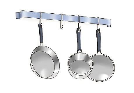 Hang pots and pans. Pots and pans are one of the largest space-fillers in your kitchen. Keep them from filling up storage areas by installing a pot rack or individual hooks on an open wall. Another good option is hanging up a piece of pegboard, which will allow you adjust the location of hooks and other hanging apparatus.