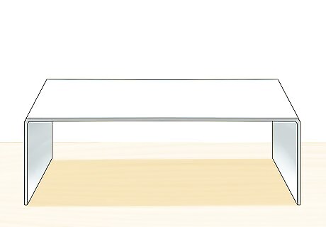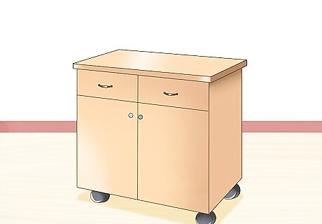 Acquire a floating island. One way to make an island work in a small kitchen is to make it mobile. This is definitely worth working into your kitchen, as it will add both surface area and storage space, and can be moved out of the way when not in use. You may simply be able to add wheels to a freestanding island you already have, or adapt a cart into a kitchenette. You can also use a build-your-own shelving unit and attach a wood cutting surface, or any surface of your choosing, to the top level with a bit of DIYing. Building your own allows you to customize it with the features that will be most helpful for you. Whatever sort of island you purchase or put together, make sure the wheels have locks so you can securely fix the island when using it.