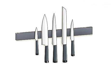Mount a magnetic strip on your wall. Want to get rid of that knife block once and for all? Easy: install a magnetic strip designed to hold knives on the wall, ideally near where you like to do your prep work. Make sure the strip is elevated, and ideally above a counter or other feature that will keep any children or pets away. Install a paper towel roll nearby too. After washing a knife, simply wipe it on the towel roll and put it on the magnet strip.