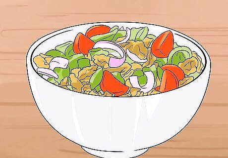 Work nuts into your meals. Nuts can provide texture, flavor, and protein to dishes. They can even be used as a healthier alternative to meat. For instance, make a veggie stir fry with walnuts, garlic, and lemon juice. Or, make a creamy, nutty sauce for your favorite steamed veggies with peanut butter, water, lime juice, soy sauce, and cayenne. Finally, crush up almonds or pistachios to season a slab of fish.