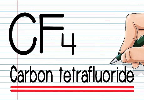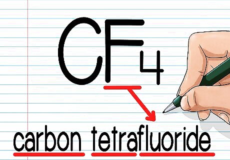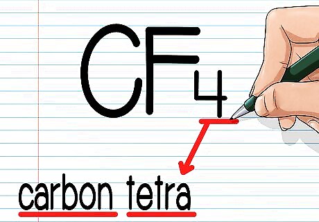 Write the Greek prefix for the number of the second atom. Next, look at the second atom in the molecule. Determine how many times it appears in the molecule. This is the number written in subscript next to it in the molecular formula. If there is no number next to the second atom, it appears once. Find the appropriate Greek prefix from the table above and write it next. In our sample element, CF4, fluorine is the second element and it appears four times. We'll write the Greek prefix for four, tetra, next, like this: "Carbon tetra-"