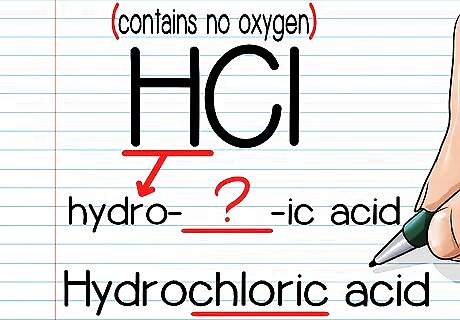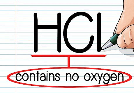 Check whether the acid contains an oxygen. Acids are compounds that donate protons to chemical reactions. Often, acids start with one or more H atoms, though there are some exceptions. The first step to naming an acid is easy: first, quickly see whether there is any oxygen (O) in it. For example, let's say that we're working with the acid HCl. This obviously does not have any oxygen in it.
