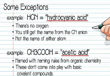 Identify acid name exceptions. As with normal covalent compounds, certain acids get special names that don't conform to the normal naming rules. There's no easy way to learn these, but they're easy to memorize as you start to come across them. Below are a few examples: HCN is "hydrocyanic acid." Here, there's no oxygen, but you still get the name from the CN anion — not the name of either atom. CH3COOH is "acetic acid." Technically, this compound is named with naming rules from organic chemistry, but these don't come into play with basic covalent compounds.