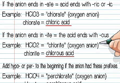 Use the name of the oxygen anion to find the name of the acid. Now that you've named the oxygen anion, finding the name of the acid itself isn't difficult. Use the following naming rules: If the anion ends in -ate, the acid ends with -ric or -ic. Example: HClO2 is chlorous acid (from "chlorate," the name of the oxygen anion). If the anion ends in -ite, the acid ends with -ous. Example: HClO3 is chloric acid (from "chlorite," the name of the oxygen anion). Add hypo- or per- to the beginning if the anion had these prefixes. Example: HClO4 is perchlorous acid (from "perchlorate," the name of the oxygen anion).