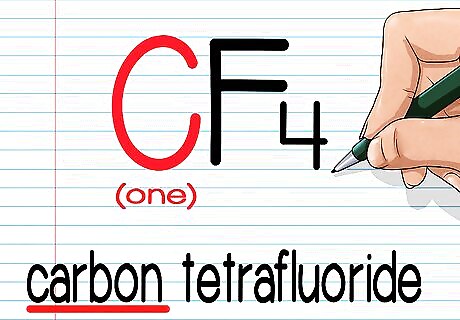 Add a Greek prefix at the beginning if there is more than one of the first atom. Determine how many times the first atom appears in the molecule. If you have the molecular formula, this will be the number written in subscript after the first atom. Again, if there is no number, the first atom appears once. If the atom does appear more than once, write its Greek prefix at the beginning of the name. In our sample element, CF4, carbon appears once, so we don't have to do anything. We wouldn't write "mono" at the beginning. You only use "mono" for the second atom — never the first. For example, dinitrogen tetrachloride would be written as N2F4.