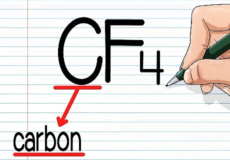 Name the first element in the compound. Molecular formulas are read from left to right, just like English words. Generally, the first atom (the 1 on the left of the molecular formula) is also the least-abundant atom in the compound. Write the name of this atom first. For example, in the molecular formula CF4, Carbon (C) comes first, so we write it first: "Carbon" If you only know the atoms in the molecule and you don't know the molecular formula, don't worry. In covalent compounds, the element that comes first in this list gets written first in the molecular formula: B, Si, C, Sb, As, P, N, H, Te, Se, S, I, Br, Cl, O, F Note that there is one exception: when oxygen is paired with a halogen (a Period 7 element like F, Cl, etc.), the halogen comes first, such as in chlorine monoxide, which is written as ClO.
