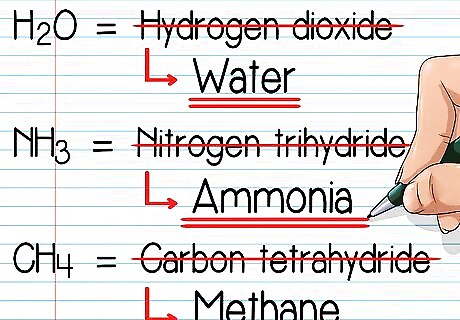 Know that certain compounds are exceptions to normal naming rules. The rules above will serve you well for nearly all normal binary covalent molecules. However, a few select molecules get special names that are almost always used when they're discussed in scientific settings. There isn't really any way to predict these — you just have to learn them. A few examples include: H2O is not Dihydrogen oxide. It's "water." NH3 is not Nitrogen trihydride. It's "ammonia." CH4 is not Carbon tetrahydride. It's "methane."