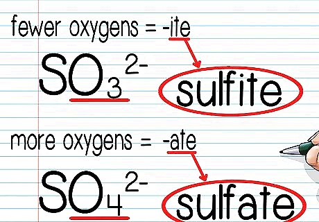 Figure out how many anions are in the same series as yours. Anions are in the same series when you can add or subtract oxygens and keep the overall charge the same by changing the oxidation state of the cation (the positively-charged part of the anion). If there are 2 anions in the same series, the 1 with fewer oxygens ends with -ite and the 1 with more oxygens ends with -ate. For instance, SO3 and SO4 are both possible depending on whether S has an oxidation state of 4+ or 6+. The first is sulfite and the second is sulfate based on their number of oxygens. If there are more than 2 anions in the same series, use the prefix "hypo" for the 1 with least oxygen and the prefix "per-" for the 1 with the most oxygen. For example, chlorine can form ClO, ClO2, ClO3, and ClO4. These are named hypochlorite, chlorite, chlorate, and perchlorate respectively.