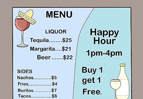 Create a great bar menu. If you're going to serve food or quality cocktails, spend a little extra on the ingredients; fresh is always better. Try to make your bar menu fit along with the theme of the bar, if it has one. A bar with a Mexican theme would be remiss not to have tequila, margaritas, or cervezas. Consider making a happy hour menu. The bottom line on your profit won't be as high, but clientele will definitely increase, and some customers will probably stay even after happy hour has passed.