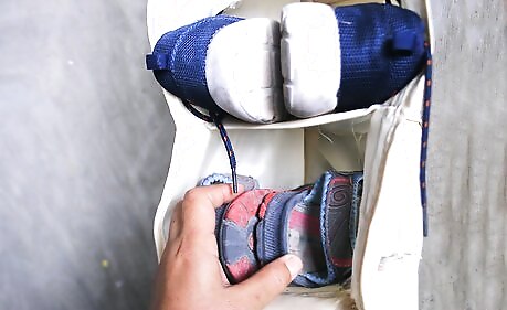 Hang the shelf. Hanging shoe shelves go over your clothing rod. They come with two hook-and-loop fastener straps. Simply wrap the straps around, and hook-and-loop them down.