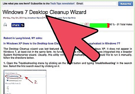 Use the Desktop Cleanup Wizard. If your version of Windows features it, you can use this automatic desktop cleanup tool. Go to "Start", "Control Panel". In the "Desktop" tab, click "Customize Desktop". Then choose "Clean Desktop Now". You can also choose to run this tool periodically. The wizard moves unused items from the desktop to an archive folder. It is the digital equivalent of scooping all that paper into a box.