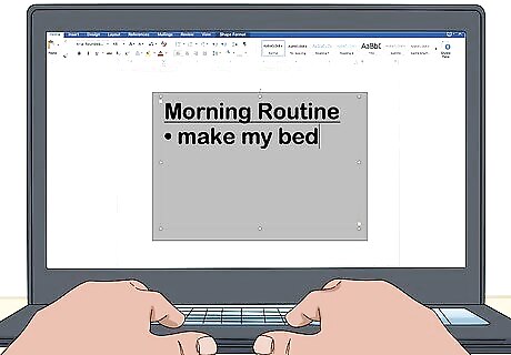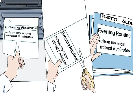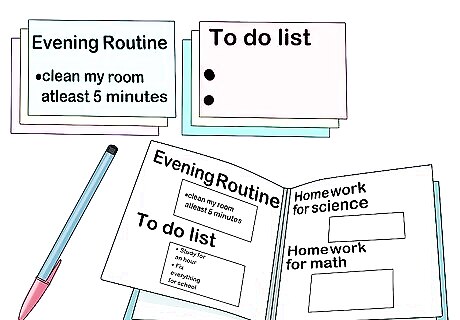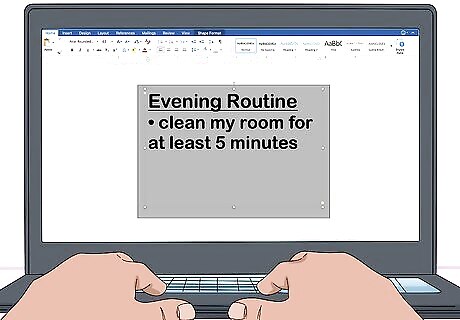 Make one last text box. It should say Evening Routine or Before Bed Routine. List everything you need to do. One of the items should be spending a quick five minutes tidying your room. This way your room will be neat each morning when you wake up. The first thing you see will be a neat and calm space. What a way to start your day!