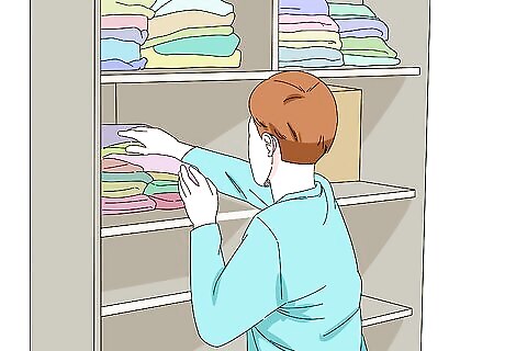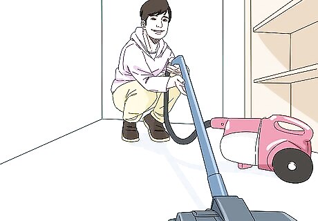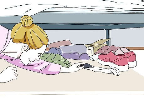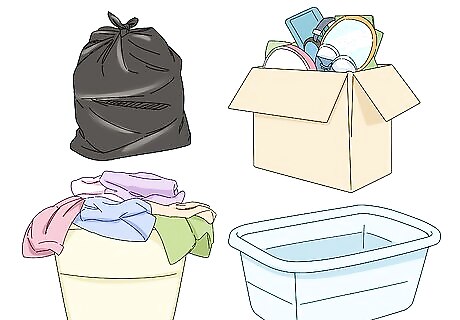 Get two laundry baskets, a trash bag, and a box. If you do not have a big box, use another laundry basket. One basket is for dirty clothes or stuff that needs washing. The other is for stuff in your room that belongs to another place in the house. The box is for things to give away, and the trash bag, obviously, is for the trash.