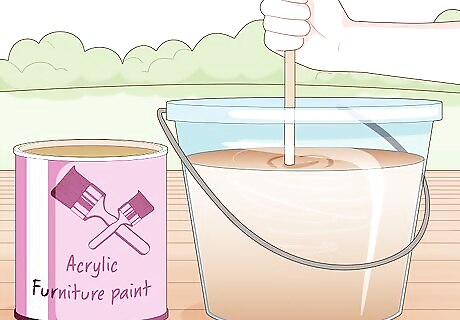 Stir your paint with a stir stick. Because you’re not sanding your furniture, you can get right to painting it! Stirring your paint gets out any globs and bubbles and makes sure the paint is all a consistent color. Once your bucket of paint is stirred, you may want to test painting on a scrap of wood to make sure it comes out the color you want.