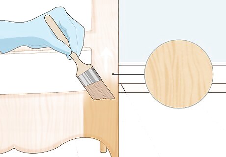 Paint the furniture in a light, even coat in the direction of the grain. The grain will be clearly visible, especially because you haven’t sanded your furniture. Dip the paintbrush in the bucket of paint and rub off any excess paint. Then paint lightly in the direction of the wood grain. Start at the bottom of the piece of furniture and work upwards. Place your paintbrush on the unpainted wood and move it towards the part you have already painted, until the paint overlaps, instead of placing your brush on the wet paint and working outward. This will avoid leaving brushstrokes.