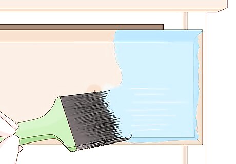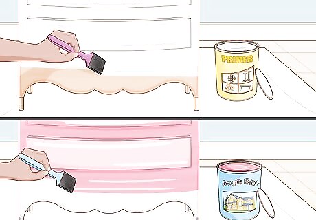 Use a bonding primer with acrylic paint. To use acrylic paint, which is commonplace and affordable, you’ll have to first apply a primer to make the paint stick to the wood. Choose a primer designed for the kind of wood your furniture is made out of. Apply a coat of primer with even brushstrokes, in the direction of the wood grain. Let the primer dry completely before applying your coat of paint. Some primers take hours to dry and some only 10 minutes.