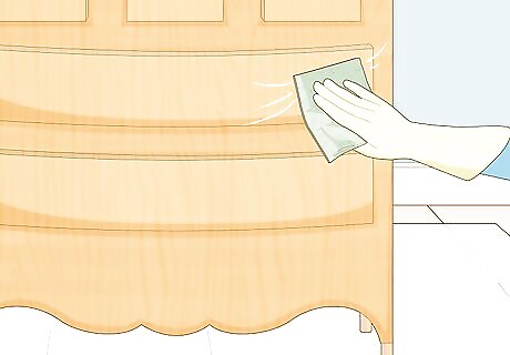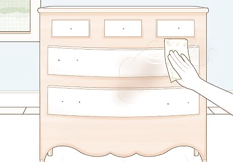 Wipe down your furniture with a tack cloth. A tack cloth is a lint-free cloth that is slightly tacky (sticky), which means it can pick up dust much better than your average cleaning rag. Getting your furniture clean before you paint it is important so that you don’t accidentally make specks of dirt stick to the furniture. A dry cloth will get off most of the dust, but if you have more stubborn grit, just wet the cloth until it is slightly damp and rub it over the furniture.