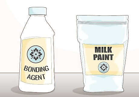 Mix milk paint with a bonding agent for an easily adhering paint. Bonding agent is a liquid substance that helps the milk paint grip onto the wood. In a bucket, mix equal parts milk paint with bonding agent. Stir completely before using. You don’t need a primer or deglosser with milk paint.