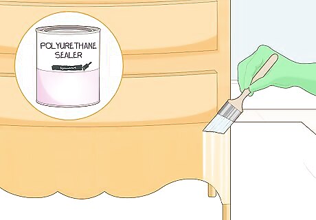 Apply a coat of wax or polyurethane sealer. Once your furniture is completely painted and dried, you can choose to seal it with wax or polyurethane. Apply the wax with a soft cloth or paint brush, in the direction of the grain. Sealer isn’t necessary but will help keep your furniture protected from scuffs and spills. Let the paint and sealer cure for 24 hours before you begin using your piece of furniture.