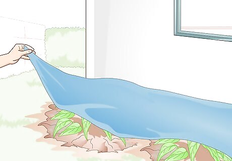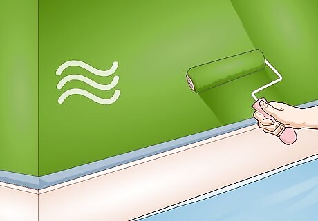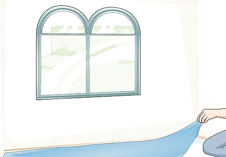 Lay out a large tarp or dropcloth beneath the surface you’re painting. Before you get started, take the time to remove any furniture or other obstacles from your work area and cover the floor with a layer of protective material. Make sure your floor cover extends all the way along the bottom part of the wall. If you like, you can use painter's tape to secure the edges and keep dripping paint from finding its way onto the floor. If possible, use a tarp or dropcloth that’s roughly the same length as the wall or ceiling you’re applying paint to. If your floor cover is on the small side, you’ll need to pause periodically and slide it down as you proceed to a new section. Newspapers and old bed sheets can also make good paint catchers if you don’t own a tarp or dropcloth. A tarp or dropcloth will do a good job of protecting your floor from wayward paint. To protect yourself, change into some old clothes that you don't mind dirtying up, and crack a window or leave a fan running to help ventilate your work space.