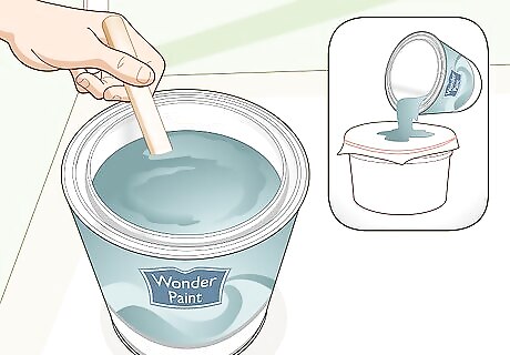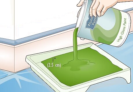 Fill a paint tray with about 1 inch (2.5 cm) of paint in your preferred shade. Pour in enough paint to keep your roller loaded throughout the painting process, but not so much that it will be at risk of drying out. You can always add more paint to the tray as needed while you work. Keep your paint tray covered with a sheet of plastic wrap or aluminum foil when you’re not using it. This will prevent the upper surface from partially drying into a rubbery film, which can end up on your walls if you’re not careful. Mixing in a small amount of chemical extender or conditioner will also keep your paint wet longer and help you cut down on time-consuming stirring and re-pours. When left uncovered and untreated, 1 inch (2.5 cm) of fresh paint will only last 1-2 hours in an open tray before drying out.