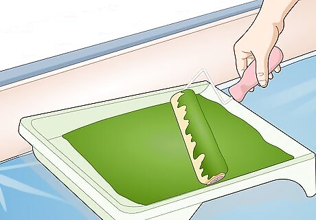 Roll the roller through the paint to load it. Lower the roller into the deepest part of the tray, then move it back and forth until the nap is covered all the way around. Before you actually begin painting, drag the roller over the raised ridges at the foot of the tray to remove excess paint. Be careful not to oversaturate your roller. By doing so, you could leave behind unsightly drip marks on the surface. If you don’t have a paint tray, transfer your paint to a 5 gallons (19 L) bucket and slide in a removable paint screen.