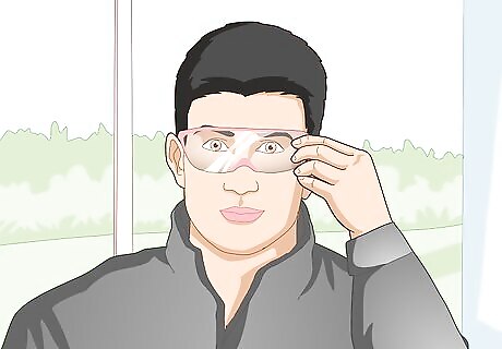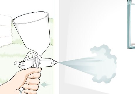 Wear long-sleeved clothing, gloves, and eye protection. Things can get a little messy when you’re wielding a paint sprayer. For this reason, it’s recommended that you cover as much exposed skin as possible. At the very least, pull on a long-sleeved shirt and pants, a pair of disposable rubber gloves, and some safety glasses or goggles. If you have sensitive airways, you may also want to strap on a facemask or ventilator to avoid breathing irritating fumes. Most types of paint can be laundered out of clothing fairly easily. Still, it’s a good idea to change into a set of clothes you don’t care to get paint on, just in case. A cheap pair of coveralls can make a good investment if you have a big project ahead of you or find yourself tackling painting tasks frequently.