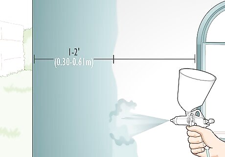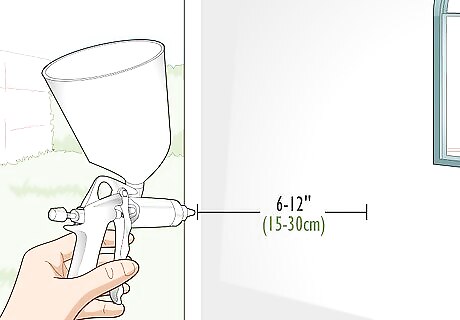 Hold the nozzle of the sprayer 6–12 inches (15–30 cm) away from the surface. This will put you in the best range to ensure an optimal balance between coverage and depth of color. Do your best to maintain this same distance the entire time that you’re spraying, including at the ends of your strokes. To guarantee a uniform finish, always keep the nozzle of the sprayer perpendicular to the surface you’re painting. The closer you bring the sprayer to the surface, the more likely you are to create drips, overly thick spots, and other imperfections. Conversely, moving the sprayer too far away will reduce your overall coverage while increasing the risk of messy overspray.