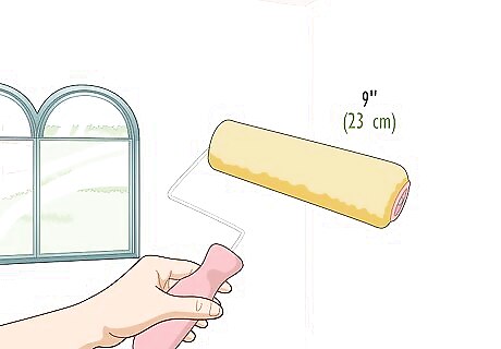 Select a roller that’s 9 inches (23 cm) or longer for faster, fuller application. Paint rollers come in a wide range of sizes, and can reach up to 18 inches (46 cm) in length. You’ll be able to coat far more of your surface per stroke with a larger applicator than you could with a more compact 4 in (10 cm) roller. Just be sure to use a paint tray that’s roomy enough to accommodate the roller size you’re working with. If you’re painting high walls or ceilings, fit your roller with an extendable handle to spare yourself the headache of constantly repositioning a ladder. Choose your tools wisely, especially if you’re an inexperienced painter. While 12 in (30 cm) rollers can cut down significantly on your total application time, their added length and weight can also make them harder to control around corners, trim, and other tricky areas. A roller cover with a ⁄4–⁄8 in (0.64–0.95 cm) nap height will be most suitable for smooth or lightly-textured surfaces, while a ⁄8–⁄4 in (0.95–1.91 cm) nap is better equipped for handling ceilings.